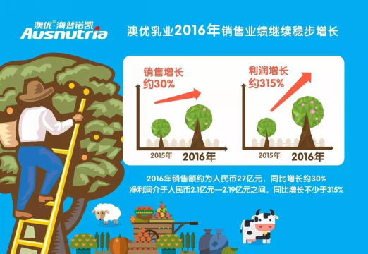 2月13日,澳优乳业发布2016年业绩盈喜公告,经初步测算,预计2016年,公司销售额约为人民币27亿元,比2015年增长约30%;实现归属于公司股东的净利润介于人民币2.1亿元—2.19亿元之间,较2015年人民币5060万元增长不少于315%。