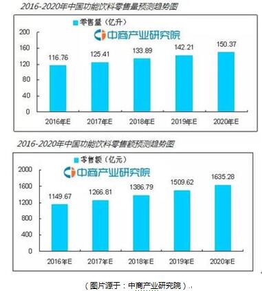目前,随着国民健康意识的提高,功能性饮料在我国受到越来越多的消费者喜爱,我国逐渐成为功能性饮料的消费大国,中商产业研究院研究显示:2009-2015年间,我国功能饮料行业零售量年均复合增长率约为13.3%,我国功能饮料年均零售额增长率16.59%,预计到2020年,我国功能饮料零售量将达到150.37亿升,零售额将达到1635.28亿元。