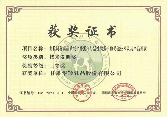 2021年9月1012日,以科技强乳 绿色发展为主题的中国乳制品工业协会第二十七次年会暨2021年中国(国际)乳业技术博览会在浙江杭州举办。 由甘肃华羚乳品股份有限公司研发团队自主研发的曲拉制备高品质牦牛酪蛋白与活性肽蛋白粉关键技术及其产品开发项目经...