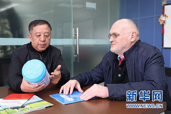郑俊怀与德国乳品专家尤尔根探讨乳品工艺话题。新华网才萌 摄