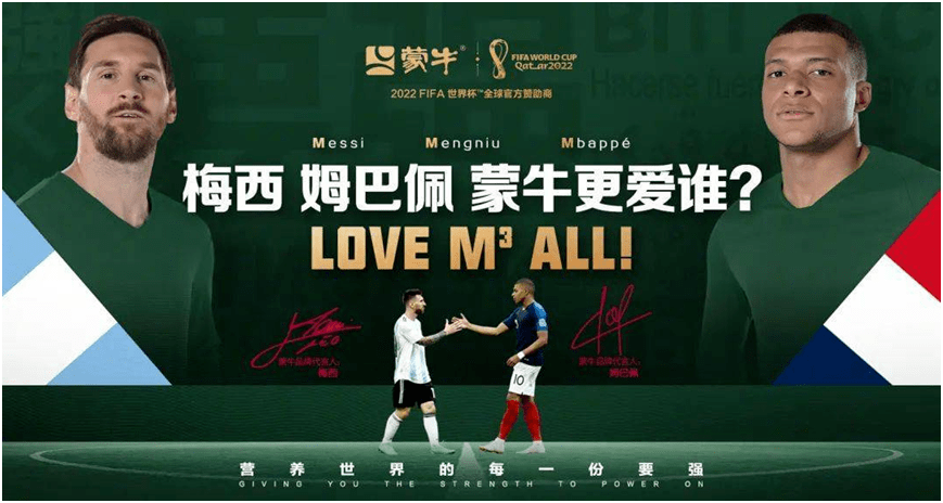“我们认为牛奶和体育存在天然的关联性,都能给人们带来健康与快乐,”李鹏程说,围绕契合的品牌理念,蒙牛长期不懈地开拓体育资源。在卡塔尔世界杯上,随着蒙牛品牌代言人梅西和姆巴佩会师决赛,“M 三次方”闪耀全场,而通过1+1>2 的“梅西+ 姆巴佩”营销“组合拳”,蒙牛也为乳业与足球合作设下天花板,让此后蒙牛与两位巨星的营销合作,更加游刃有余。