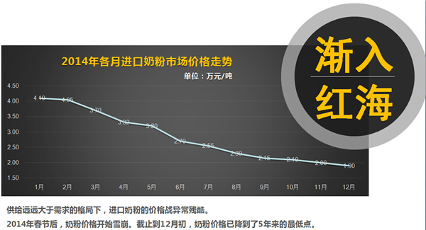 二是乳制品的价格。如在澳大利亚,Coles超市2升鲜奶,2013年卖3.2澳元,如今只卖2澳元,全脂鲜奶零售价每2升2澳元,折人民币5.5元/升;在美国,普通全脂鲜牛奶3.88美元/加仑,即1美元/升(折人民币6.2元/升),有机全脂鲜牛奶7.42美元/加仑,即2美元/升(折人民币12.4元/升);从全球来看,中国市场上的的幼儿配方奶粉价格也明显高于全球;另外,在供给远远大于需求的格局下,进口奶粉的价格战异常残酷。2014年春节后,奶粉价格开始雪崩。截止到12月初,奶粉价格已降到了5年来的最低点。