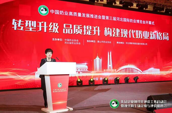 唐山市副市长张月仙致辞唐山市副市长张月仙指出,奶业是唐山现代农业的优势特色产业,2020年,日处理鲜奶3500吨以上,乳制品年产量达到115万吨、位居全省第一。近年来,唐山深入贯彻落实国家和省奶业振兴意见,坚持标准化导向,打造一流奶源基地;坚持绿色化导向,打造一流乳品品质;坚持品牌化导向,打造一流加工基地。加快推进奶业创新发展、绿色发展、高质量发展,全面扛起了河北省奶业振兴的“唐山旗帜”。