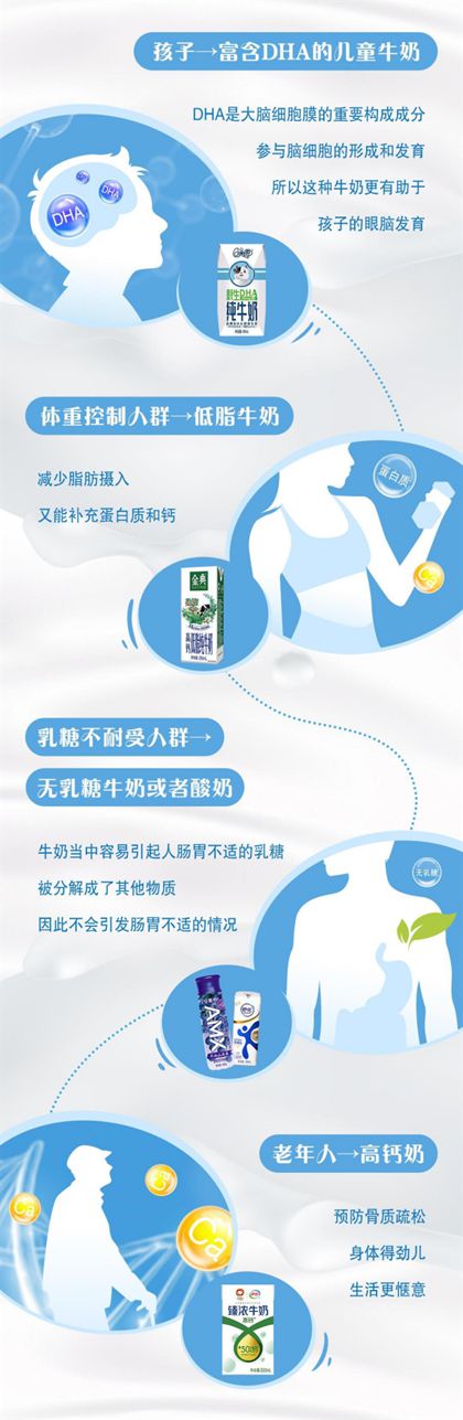 现在市场上的乳制品种类很多,乳品企业通过科技创新,研发出多种适合不同人体需求的产品,消费者可根据自身情况选择更适合自己的牛奶。比如,孩子可优先选择富含DHA的儿童牛奶,因为DHA是大脑细胞膜的重要构成成分,参与脑细胞的形成和发育,所以这种牛奶有助于孩子的眼脑发育;体重控制人群建议选择低脂牛奶,在减少脂肪摄入的同时,也不会缺乏蛋白质和钙;老年人的新陈代谢相对来说比较慢一些,且骨质流失比较快,所以建议选择高钙产品。